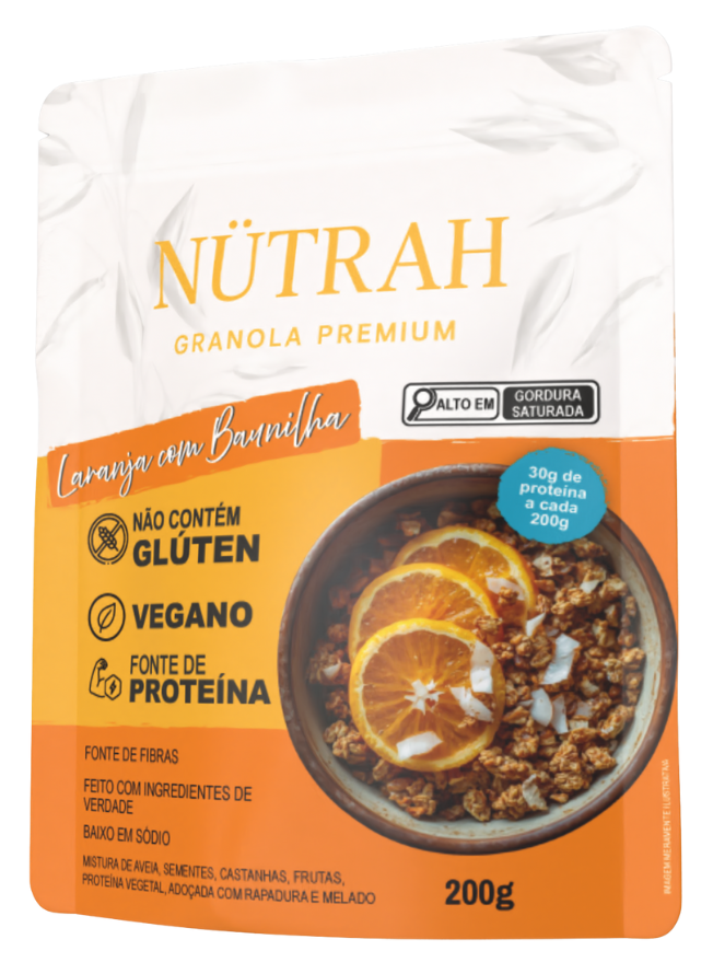 Granola protéica com toque cítrico da laranja e suavidade da baunilha. Feita com proteína vegetal, sem glúten e adoçada naturalmente com rapadura e melado.