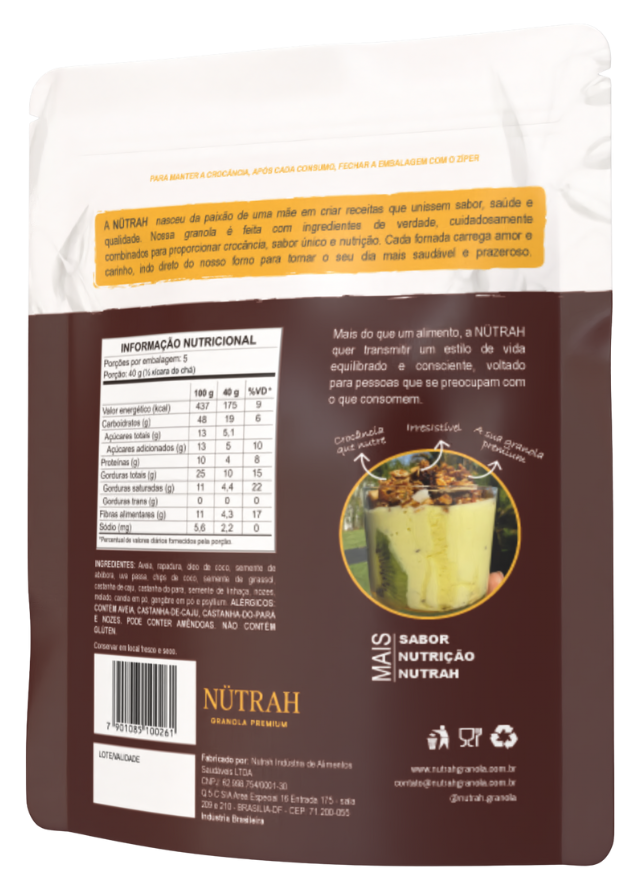 Feita com aveia sem glúten, repleta de castanhas e sementes selecionadas, ricas em gorduras boas, que auxiliam na saúde do coração e do cérebro, e fornecem minerais essenciais como magnésio, zinco e vitamina E. É fonte de fibras e baixa em sódio, ajudando na saciedade e no bom funcionamento do intestino.